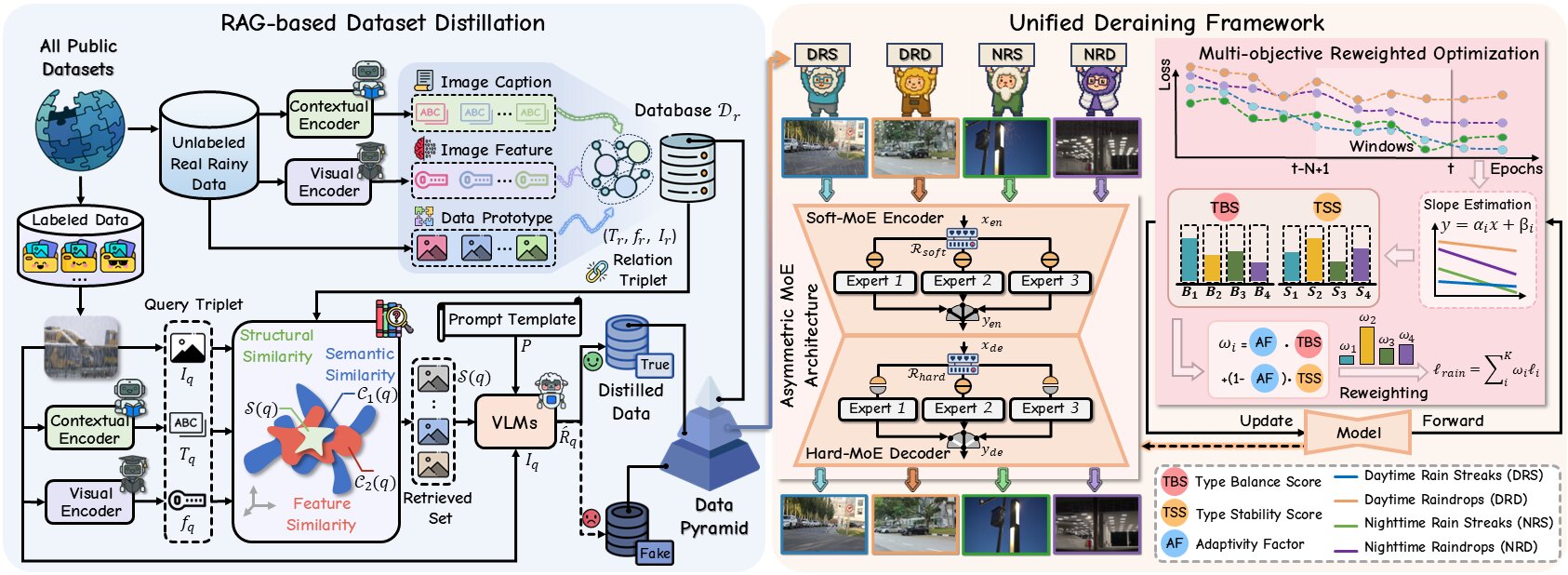 UniRain: Unified Image Deraining with RAG-based Dataset Distillation and Multi-objective Reweighted Optimization